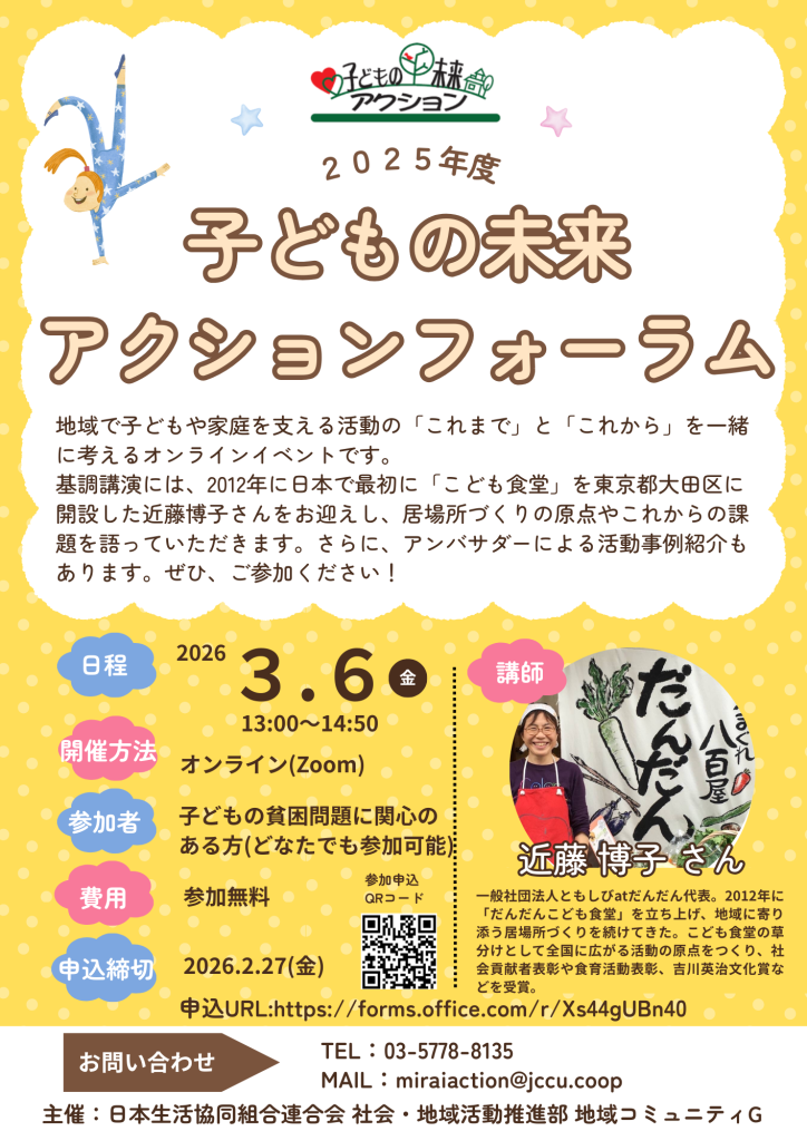 今回のフォーラムでは、2012年に日本で最初に「こども食堂」を東京都大田区に開設した近藤博子さんをお迎えし、居場所づくりの原点やこれからの課題について語っていただきます。さらに、アンバサダーによる活動事例紹介も予定しています。ぜひ、ご参加ください!