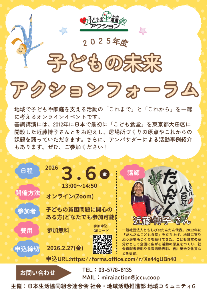 今回のフォーラムでは、2012年に日本で最初に「こども食堂」を東京都大田区に開設した近藤博子さんをお迎えし、居場所づくりの原点やこれからの課題について語っていただきます。さらに、アンバサダーによる活動事例紹介も予定しています。ぜひ、ご参加ください!